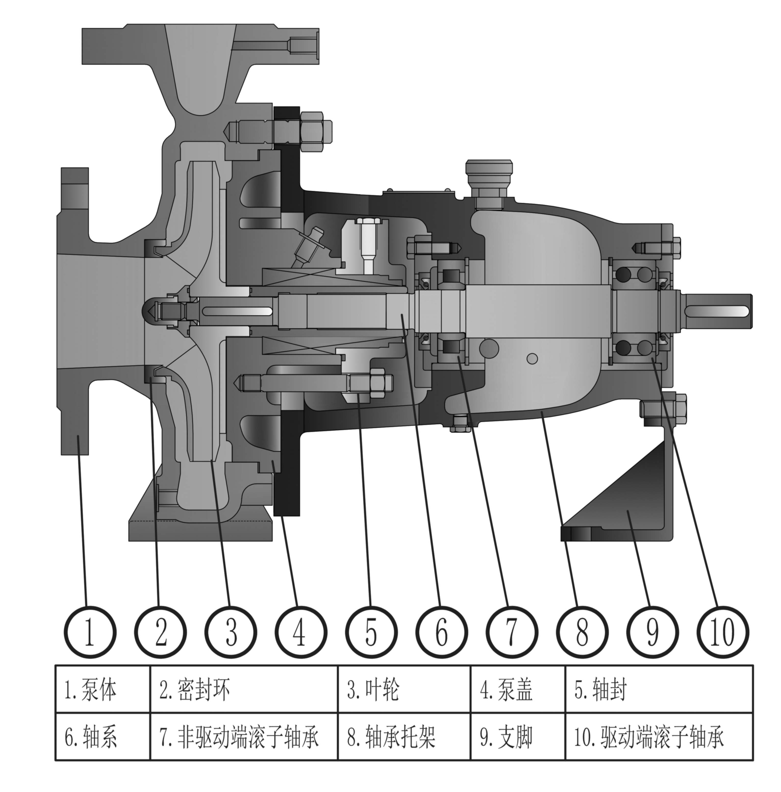 該泵為單級(jí)、臥式徑向剖分蝸殼泵,泵體為腳支撐。單吸徑向葉輪,軸向吸入,徑向排出。