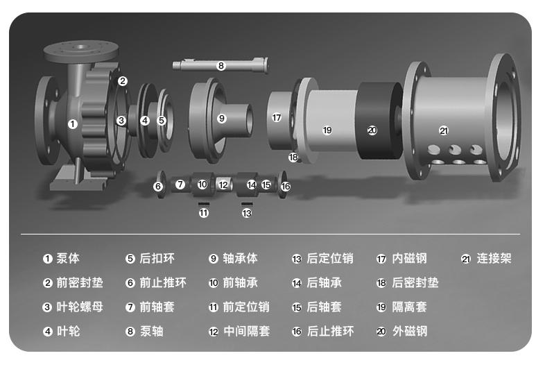 脫硝氨水泵主要由泵體、葉輪、泵軸、軸承、軸承體、隔離套、止推環、聯接架、磁傳動器等零部件組成。